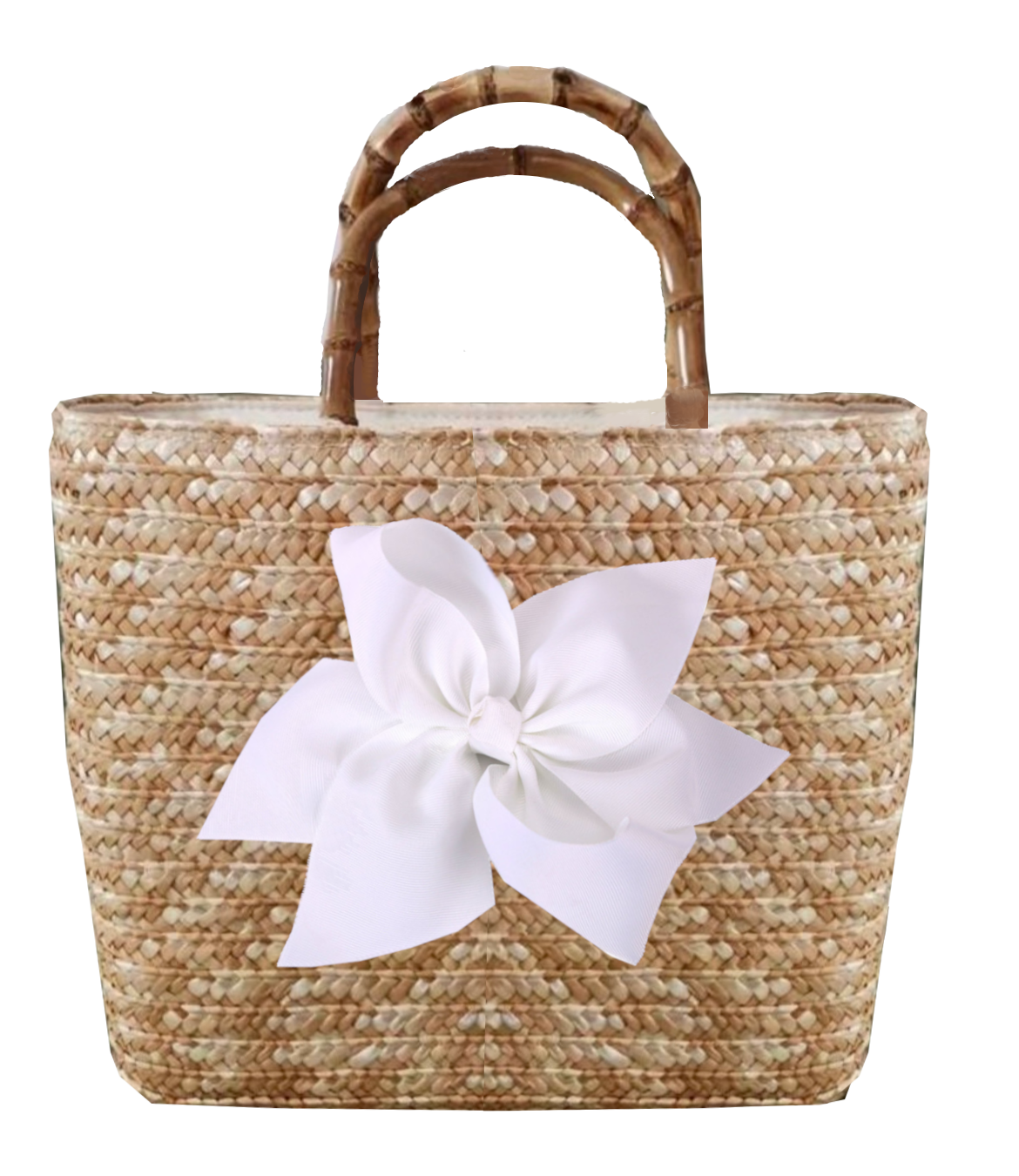 This tote is a woven straw bag with bamboo handles. The bag measures approximately 12" x 10" x 4". It is fully lined and has an interior pocket. The bag closes with a zipper closure. It comes with one bow. The bow attaches with a magnetic snap and is interchangeable. Other bow colors are available in my shop. Bows also sold separately.